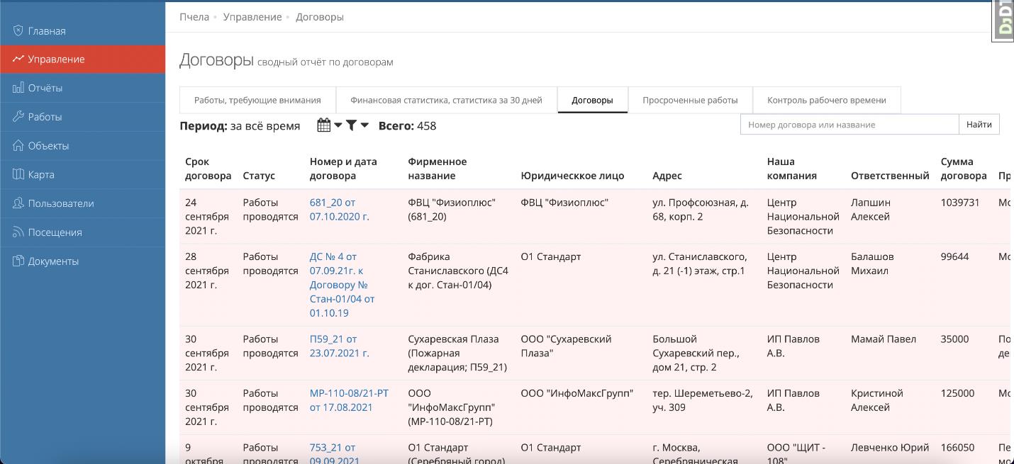 Информация о договорах заносится в карточке Объекта. В этот раздел попадают договоры, по объектам которых проводятся работы. Т.е. приостановка работ по объекту уберёт договор из этого списка.